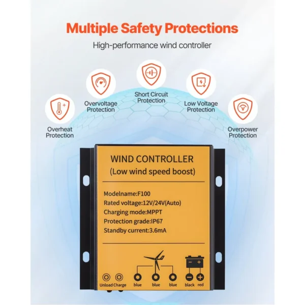 • Optimierte Nutzung der Windenergie: Unsere dreiflügelige Windkraftanlage bietet eine langsame Anlaufgeschwindigkeit von 2,5 m/s, eine Nenngeschwindigkeit von 12 m/s und einen Rotordurchmesser von 150 cm. In Verbindung mit dem MPPT-Windkraftregler verfolgt sie auf intelligente Weise den optimalen Wirkungsgrad der Windkraftanlage und maximiert so die Energieumwandlung und -erzeugung.